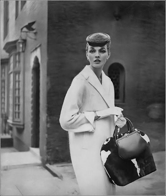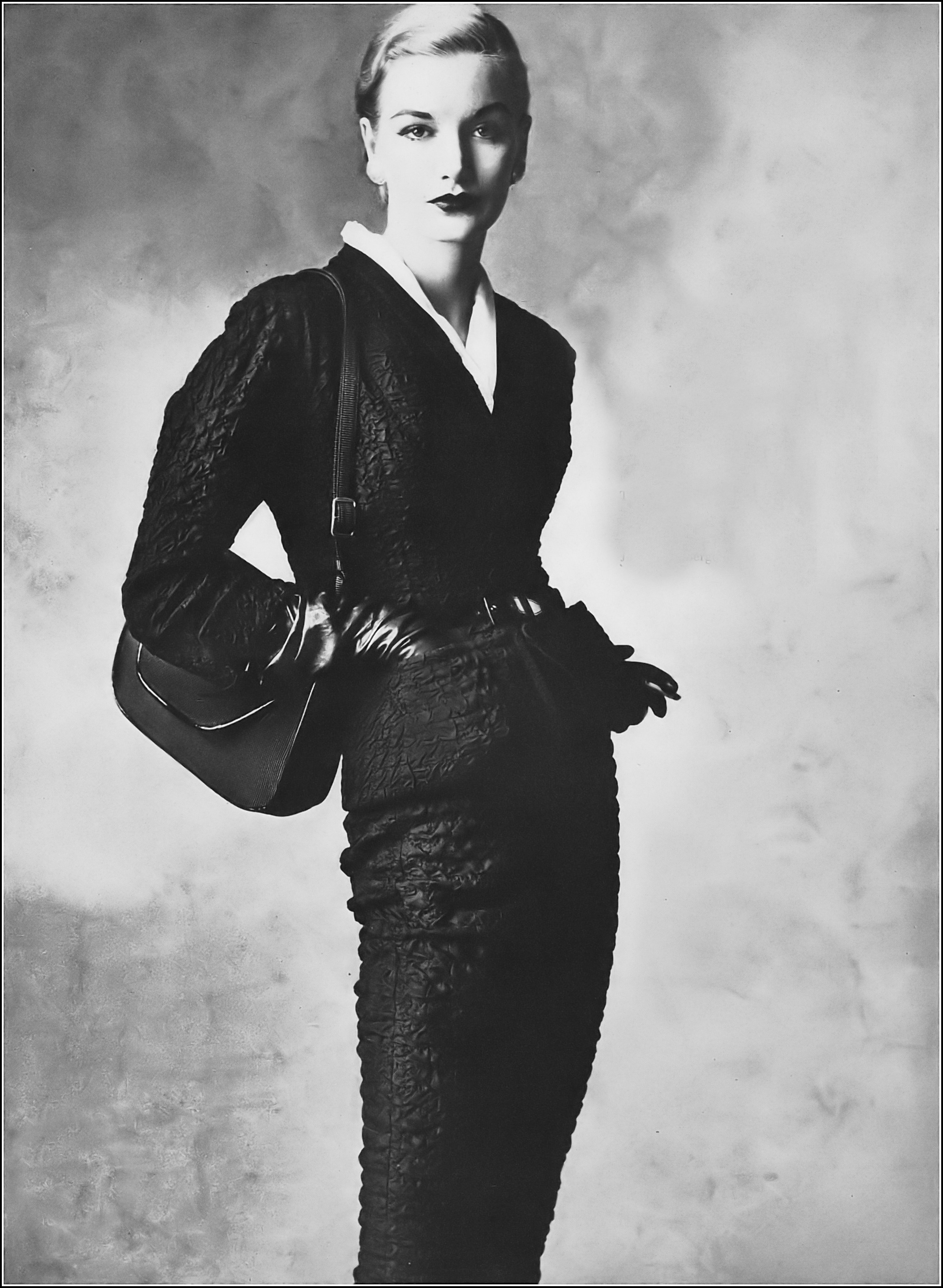| Linda Harper in black-and-white print dress with a big loose bow by Nelly Don in a Signature Fine Arts Print, photo by Lillian Bassman, Harper's Bazaar, February 1954 |